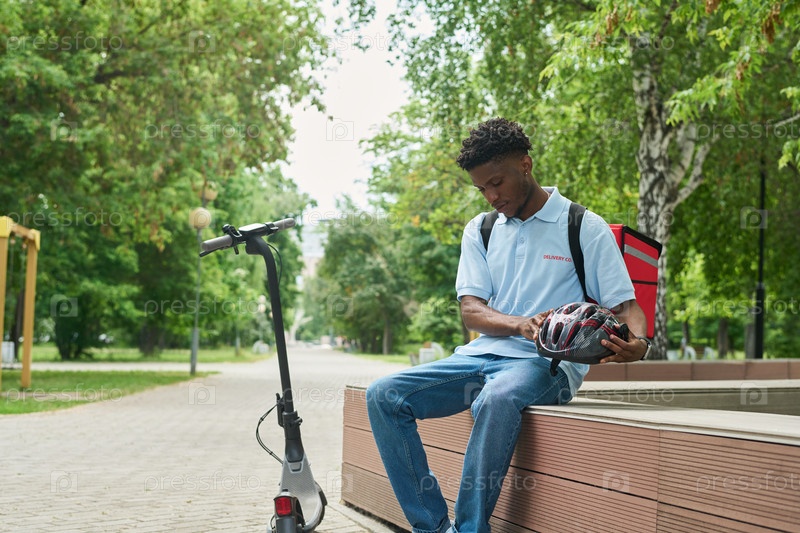 Черный мужчина готовится к поездке по доставке с электрическим скутером на открытом воздухе