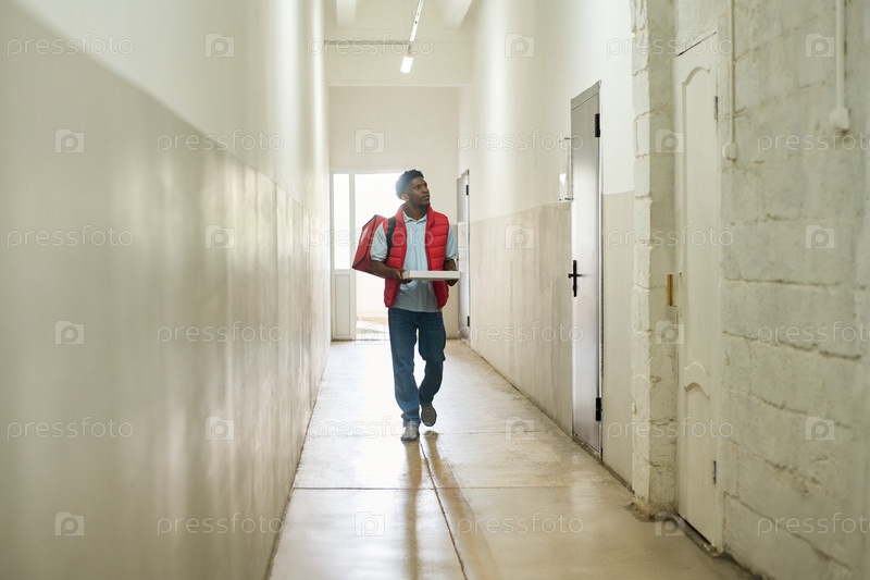 Чернокожий человек доставляет пакет, когда идет по коридору