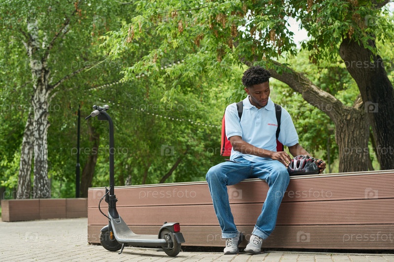 Черный мужчина сидит на улице, готовя шлем рядом с электрическим скутером