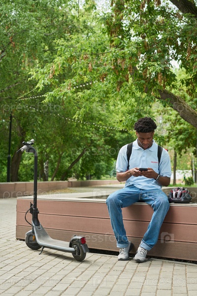 Черный мужчина сидит на улице, используя смартфон возле электрического скутера