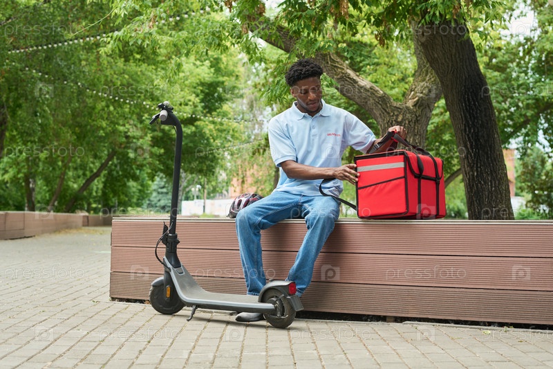 Чёрный мужчина сидит на улице, готовясь к доставке еды