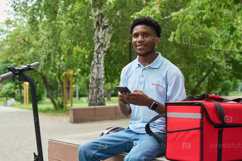 Чернокожий мужчина использует смартфон, работая курьером на открытом воздухе
