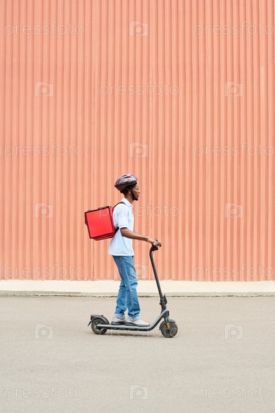 Черный мужчина едет на электрическом скутере, несущий рюкзак для доставки продуктов питания