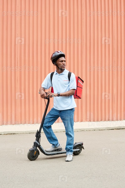 Черный мужчина стоит с электрическим скутером, доставляя еду на открытом воздухе