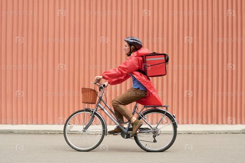 Женщина на велосипеде доставляет еду на открытом воздухе