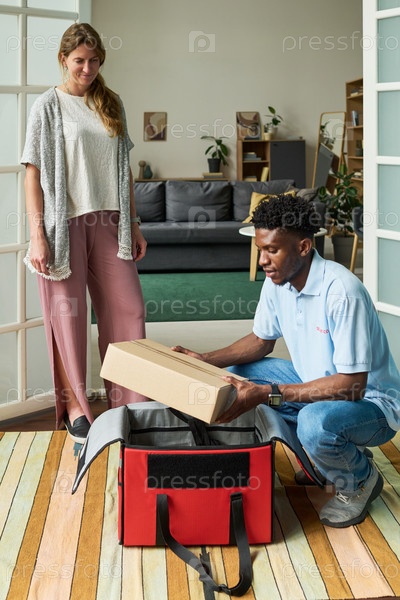 Женщина наблюдает за темным мужчиной, доставляющим посылки в помещении