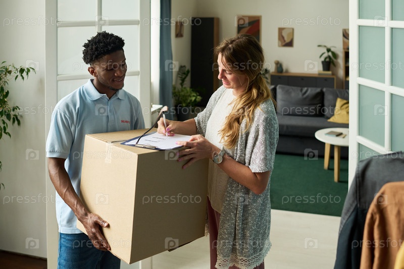 Женщина подписывает форму доставки, в то время как чернокожий мужчина держит коробку