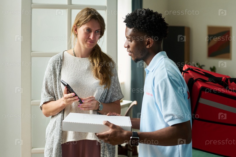 Женщина, получающая доставку еды от чернокожего мужчины в помещении