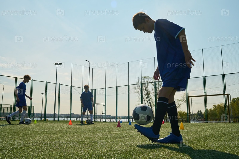 Мальчики-подростки балансируют футбольный мяч на ногах во время тренировок на открытом воздухе