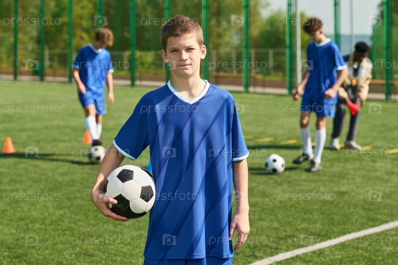 Портрет мальчика-подростка, держащего футбольный мяч на спортивном поле