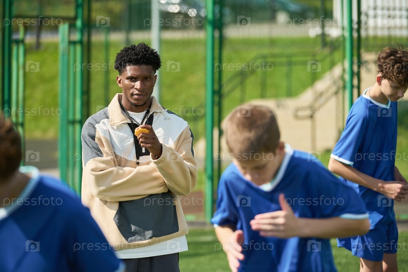 Чернокожие мужчины тренируют группу подростков, занимающихся спортом на открытом воздухе