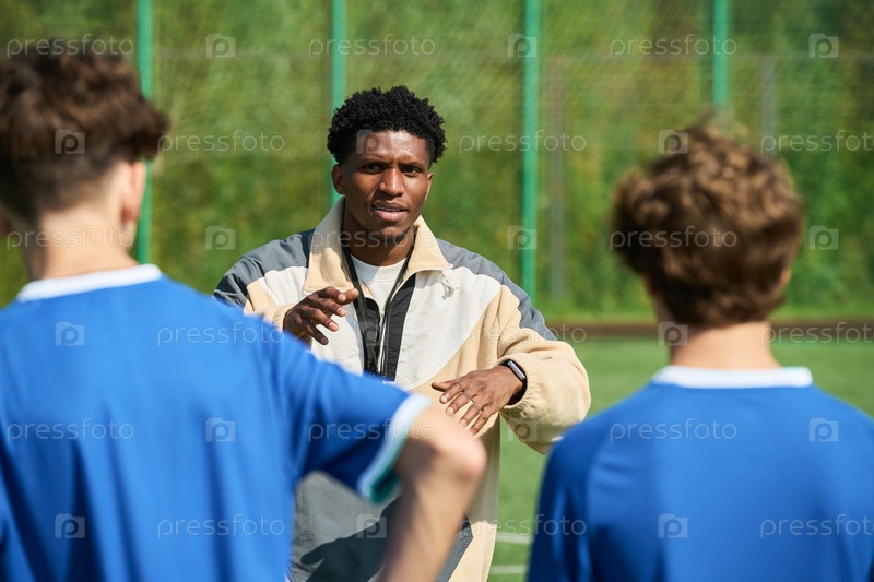 Черный мужчина тренирует мальчиков-подростков во время практики футбола на открытом воздухе