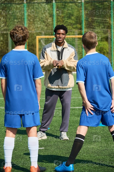 Черный мужчина тренирует мальчиков-подростков во время обучения футболу на открытом воздухе