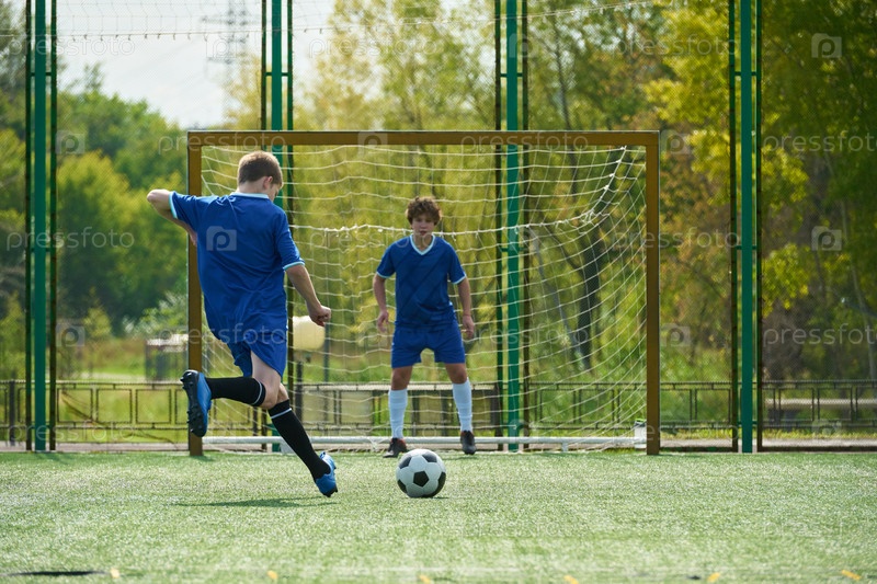 Мальчик-подросток бьет футбольный мяч в сторону цели, а вратарь смотрит