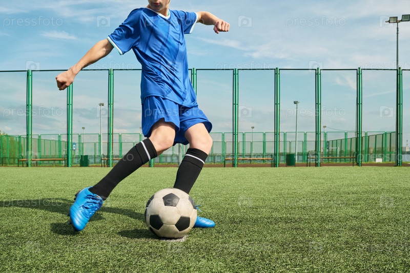 Мальчик-подросток контролирует футбольный мяч во время тренировки на открытом воздухе