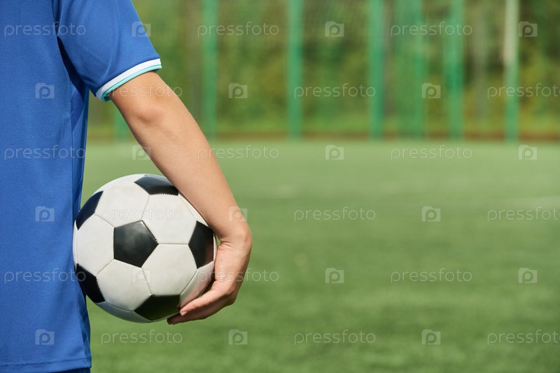 Подросток держит футбольный мяч на открытом поле перед игрой
