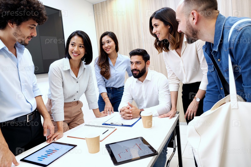 Мультиэтнические молодые взрослые сотрудничают во время деловой встречи в офисе