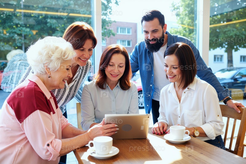 Группа разнообразных взрослых, сотрудничающих вокруг планшета в Bright Cafe Setting