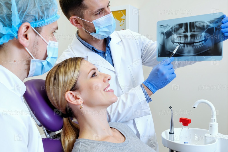 Молодая взрослая женщина получает стоматологическую консультацию от мужских стоматологов