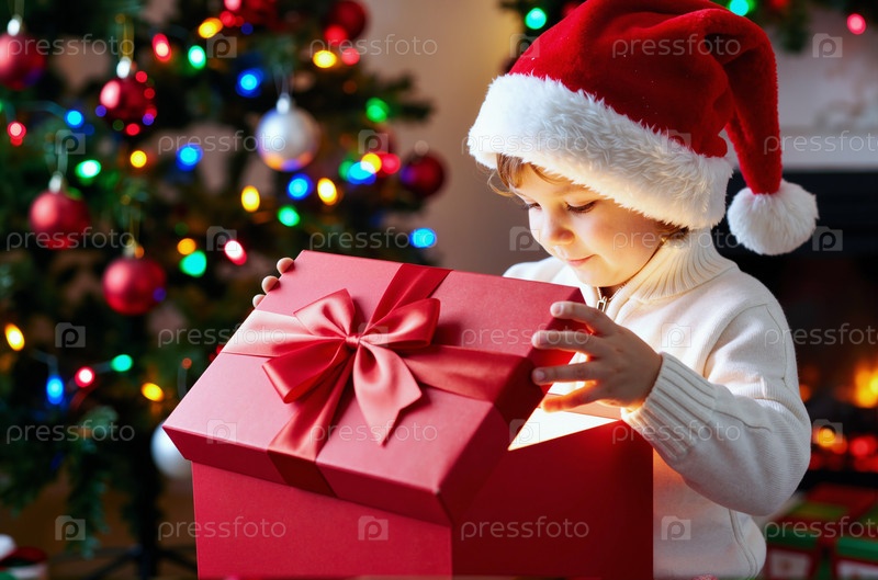 Дети, носящие Санта-Хет открывающую коробку с подарками возле рождественской елки