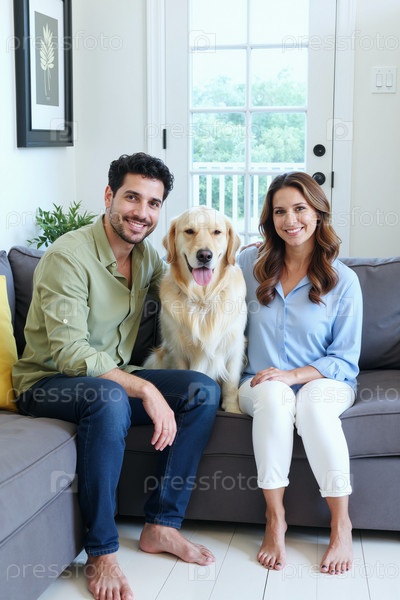 Молодой мужчина и женщина сидят на диване, улыбаясь золотому ретриверу