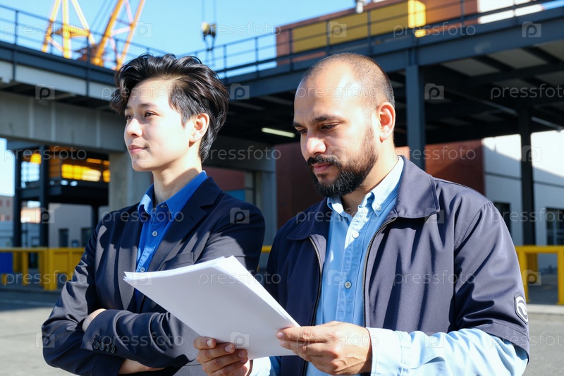 Молодая азиатская женщина и мужчина среднего возраста просматривают документы на открытом воздухе