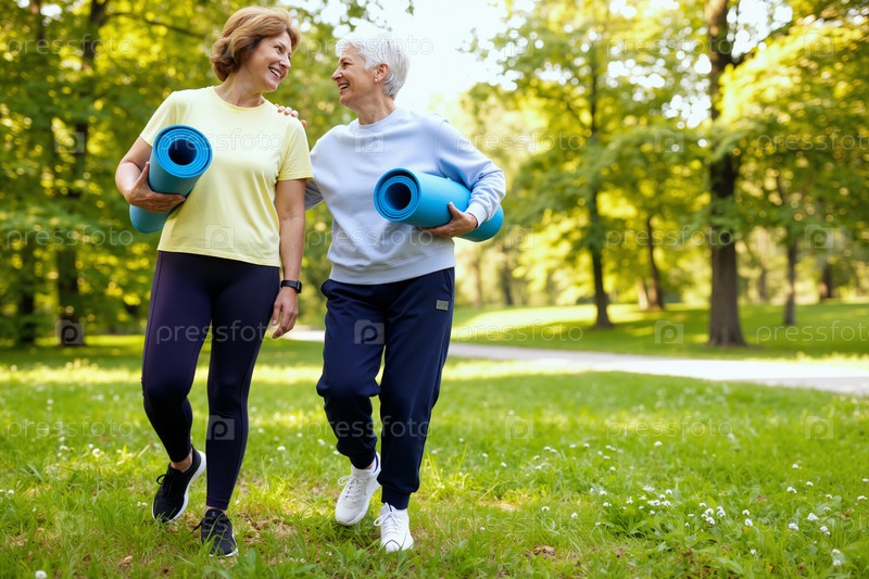 Две пожилые женщины ходят на улице, неся маты для йоги и улыбаясь