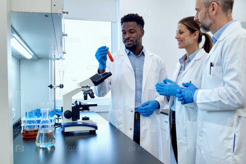 Молодой взрослый чернокожий мужчина ведущий мультиэтнические ученые, проводящие лабораторные эксперименты