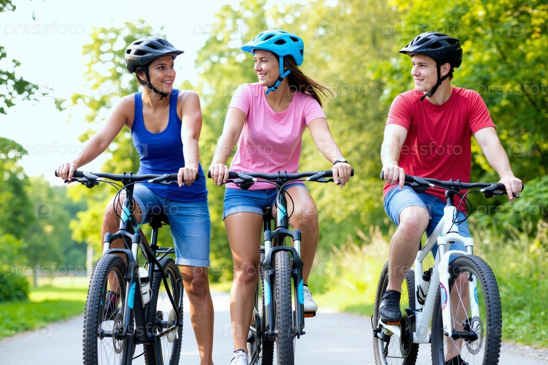 Группа молодых взрослых, которые вместе ездят на велосипеде в открытом воздухе и улыбаются