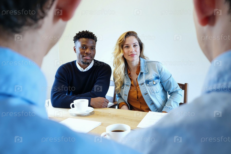 Мультиэтническая пара посещает собеседование по работе с двумя молодыми мужчинами