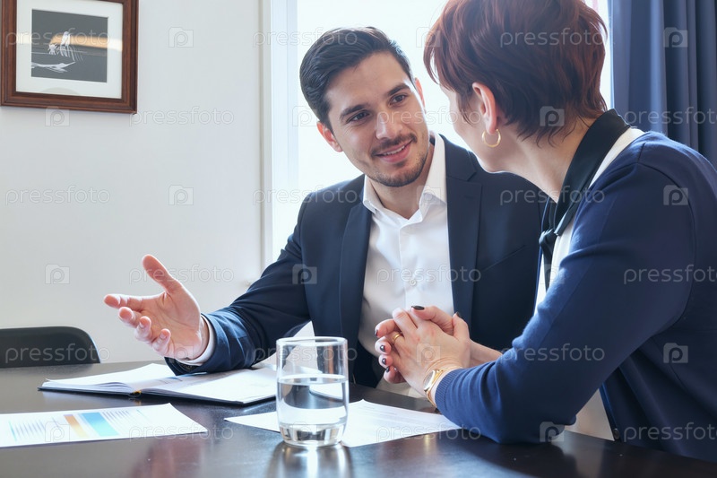 Молодой человек обсуждает бизнес-стратегию с женщиной средних лет