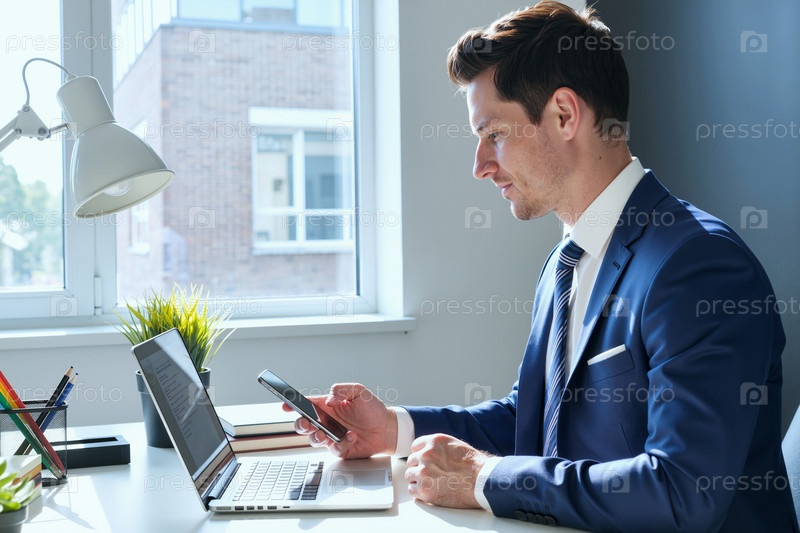 Молодой взрослый мужчина использует смартфон во время работы за офисным столом