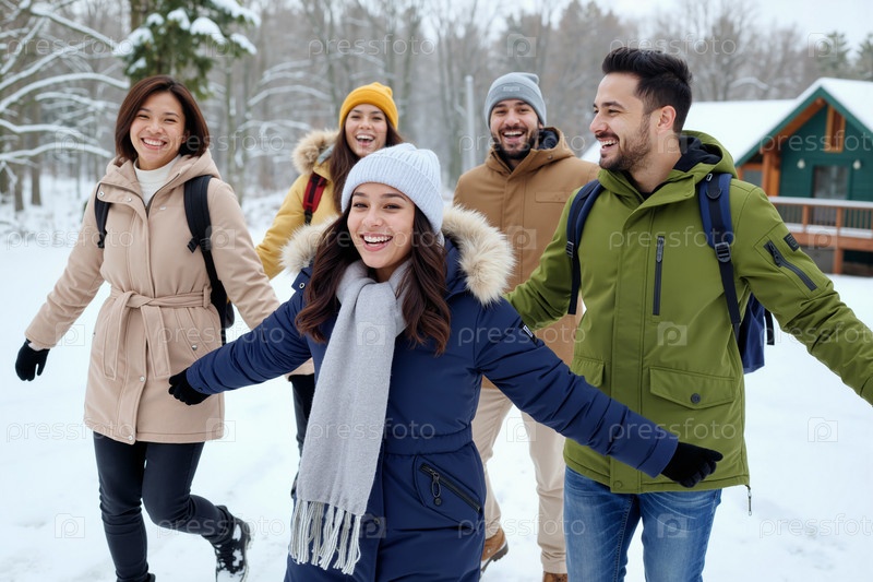Мультиэтнические молодые взрослые гуляют на свежем воздухе, улыбаясь во время зимних каникул
