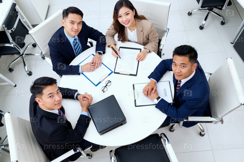 Группа молодых взрослых азиатских бизнес-профессионалов, обсуждающих документы вместе