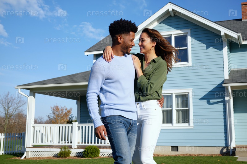 Молодая взрослая мультиэтническая пара улыбается и обнимает на открытом воздухе возле дома