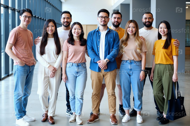 Группа разнообразных молодых взрослых, улыбающихся и стоящих вместе в помещении