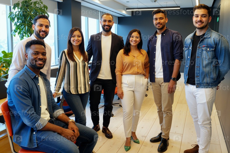 Разнообразные молодые люди, улыбающиеся вместе в современной офисной среде