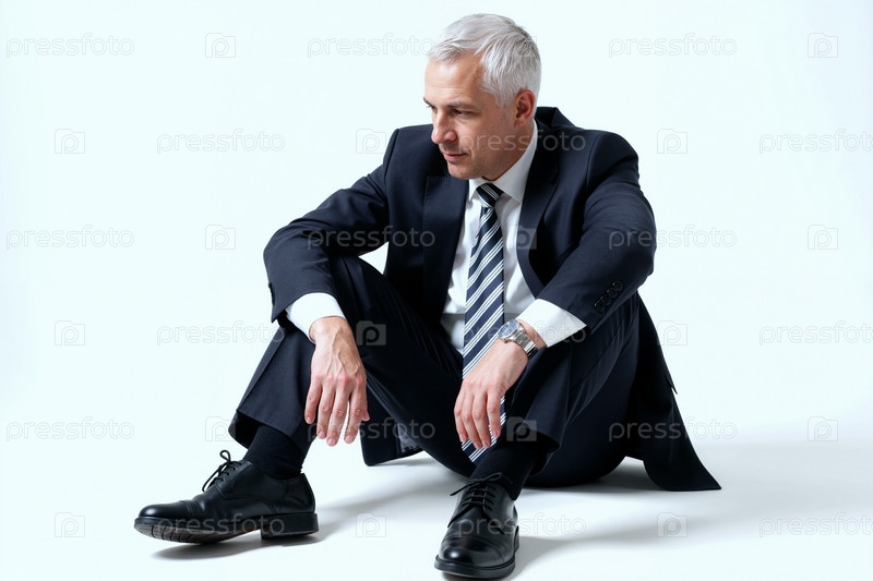 Мужчина средних лет сидит на полу, одетый в деловое обмундирование и думает