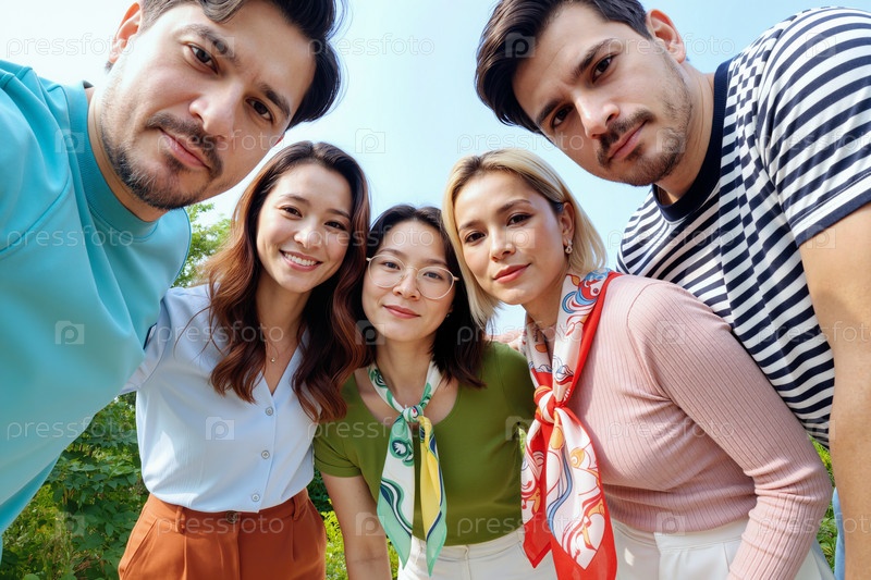 Группа молодых мультиэтнических взрослых, улыбающихся и склоняющихся к камере на открытом воздухе