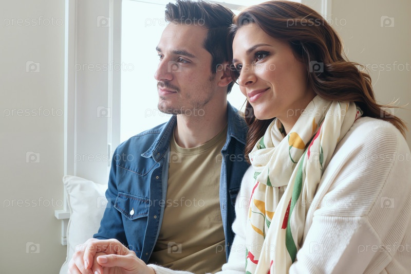 Молодая взрослая пара сидит вместе, улыбается и смотрит в сторону