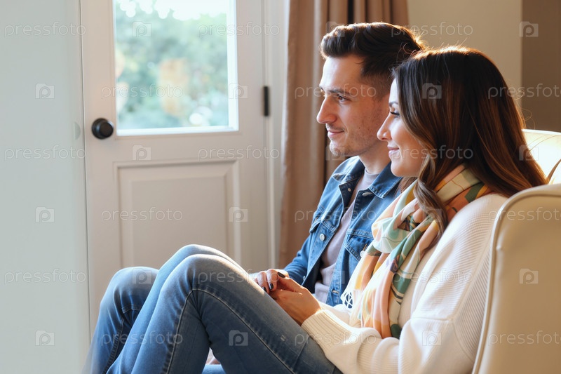 Молодой мужчина и молодая женщина сидят вместе, улыбаются и смотрят в будущее