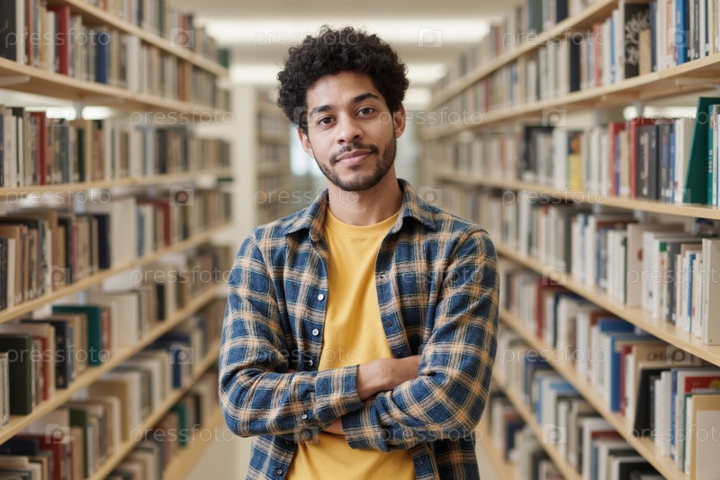 Портрет молодого взрослого латиноамериканского мужчины, уверенно стоящего в коридоре библиотеки