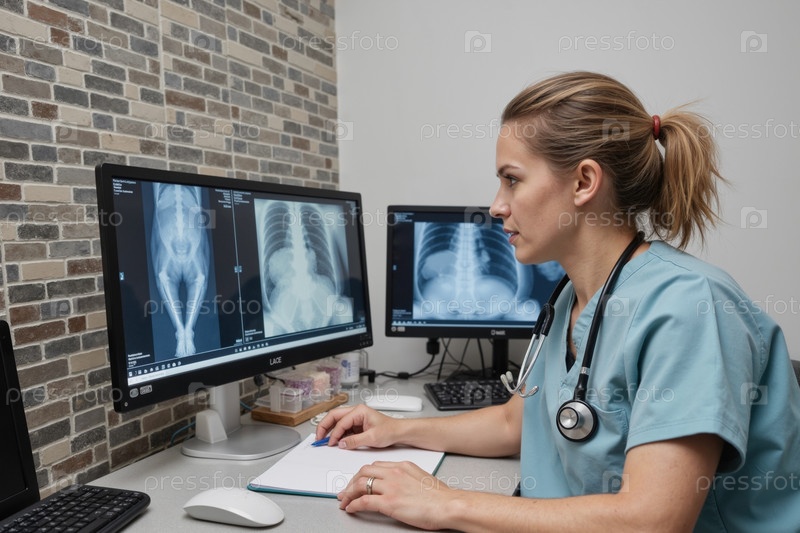 Молодой взрослый цикасианская женщина ветеринар анализирующий животных рентгеновские изображения