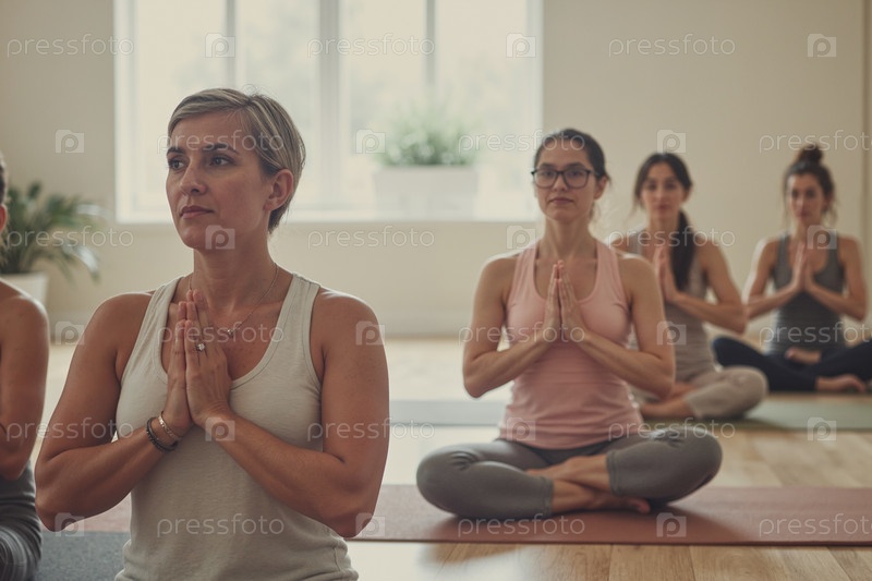 Группа женщин среднего возраста и молодых взрослых, практикующих медитацию йоги в помещении