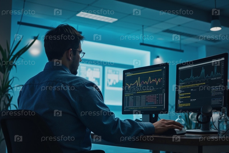 Молодой взрослый мужчина анализирует финансовые данные на компьютерных мониторах