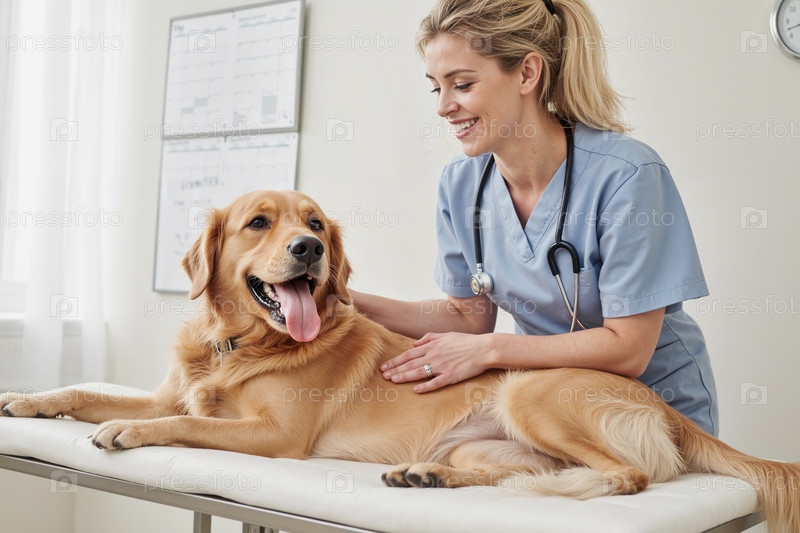Молодая взрослая женщина ветеринарная экспертиза золотого ретривера собака пациент