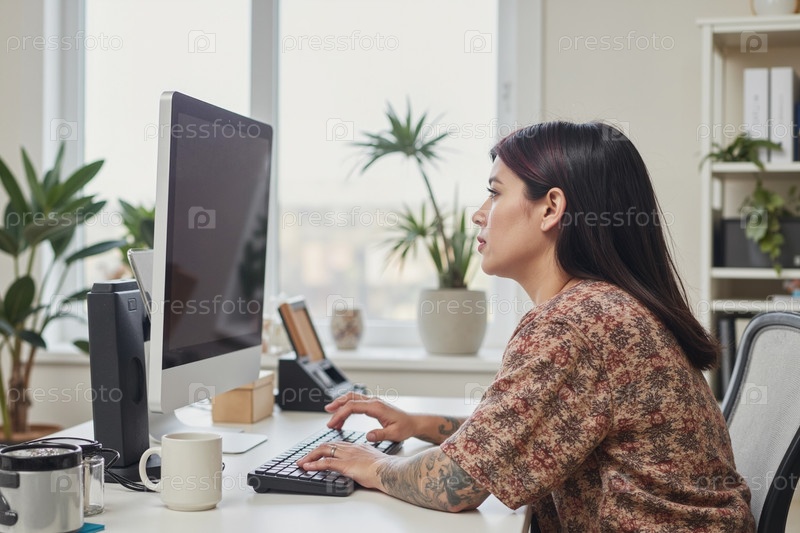 Молодая взрослая женщина работает на компьютере в современной офисной среде