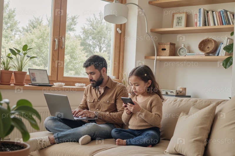 Молодой взрослый мужчина работает на ноутбуке рядом с ребенком Девушка использует смартфон