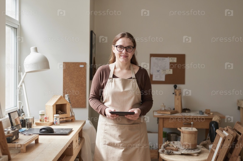 Портрет молодой взрослой женщины, держащей планшет в студии деревообработки