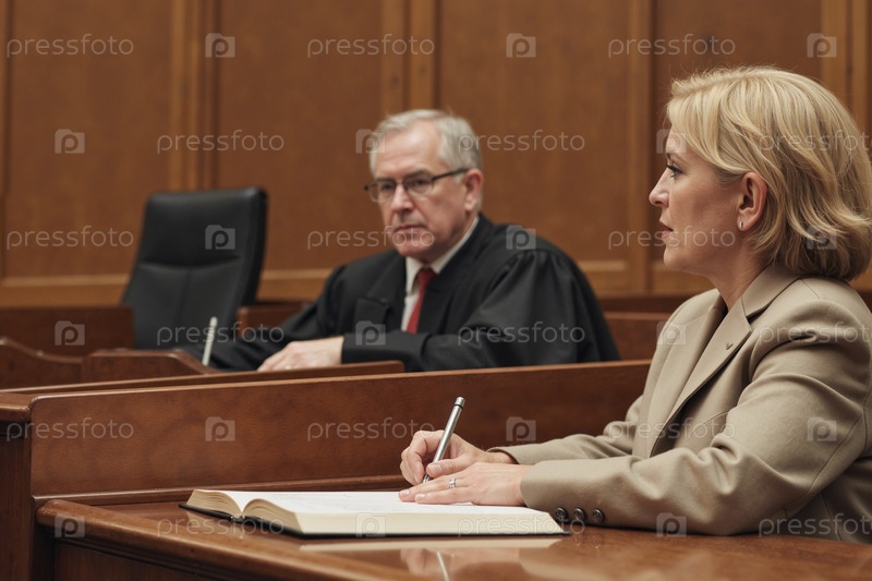 Женщина средних лет, дающая показания в зале суда с наблюдающим судьей